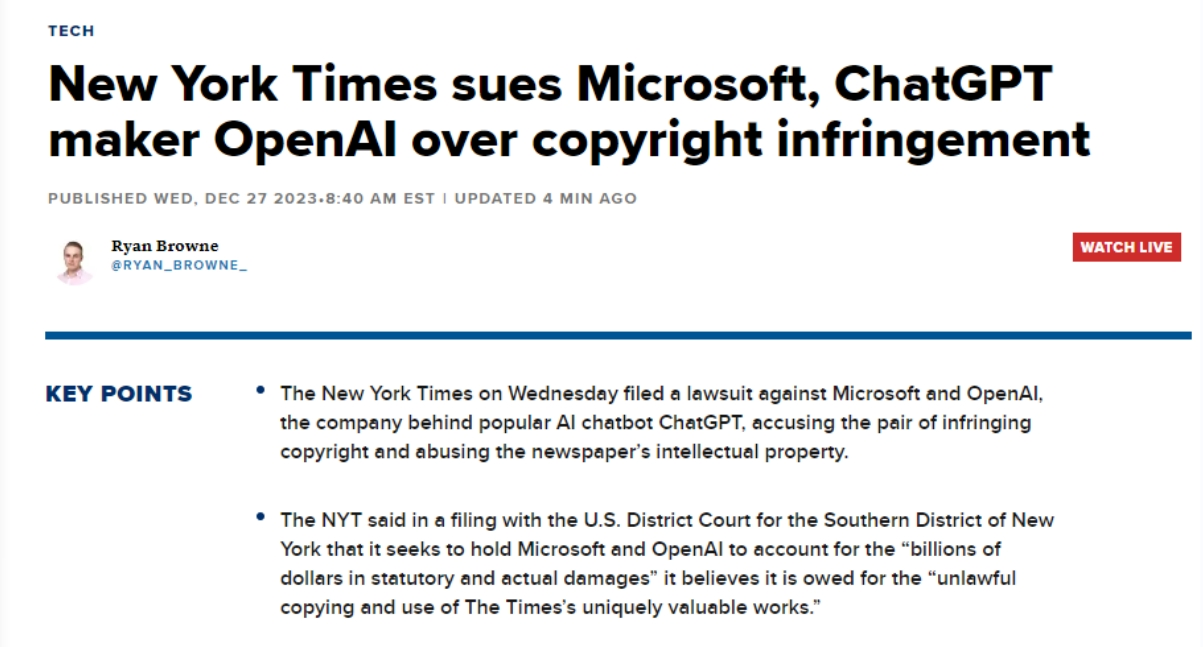 其认识到生成式AI对和旧事业的影响力和潜力,《纽约时报》提及的一个AI系统不合理利用其内容并形成丧失的例子是,