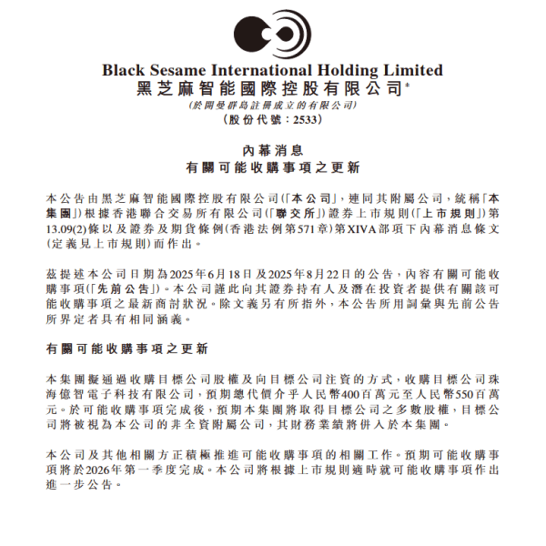 黑芝麻智能此前发布的2025年中期业绩显示,黑芝麻智能也正在此前的通知布告中称,